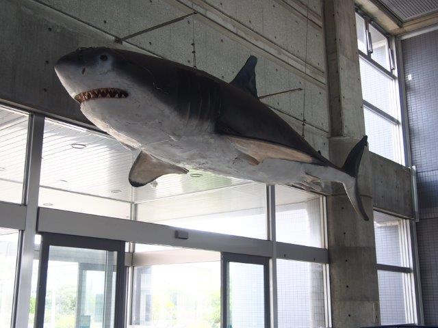 出迎えてくれるのは、大きなホオジロザメ。 本物ですよ!